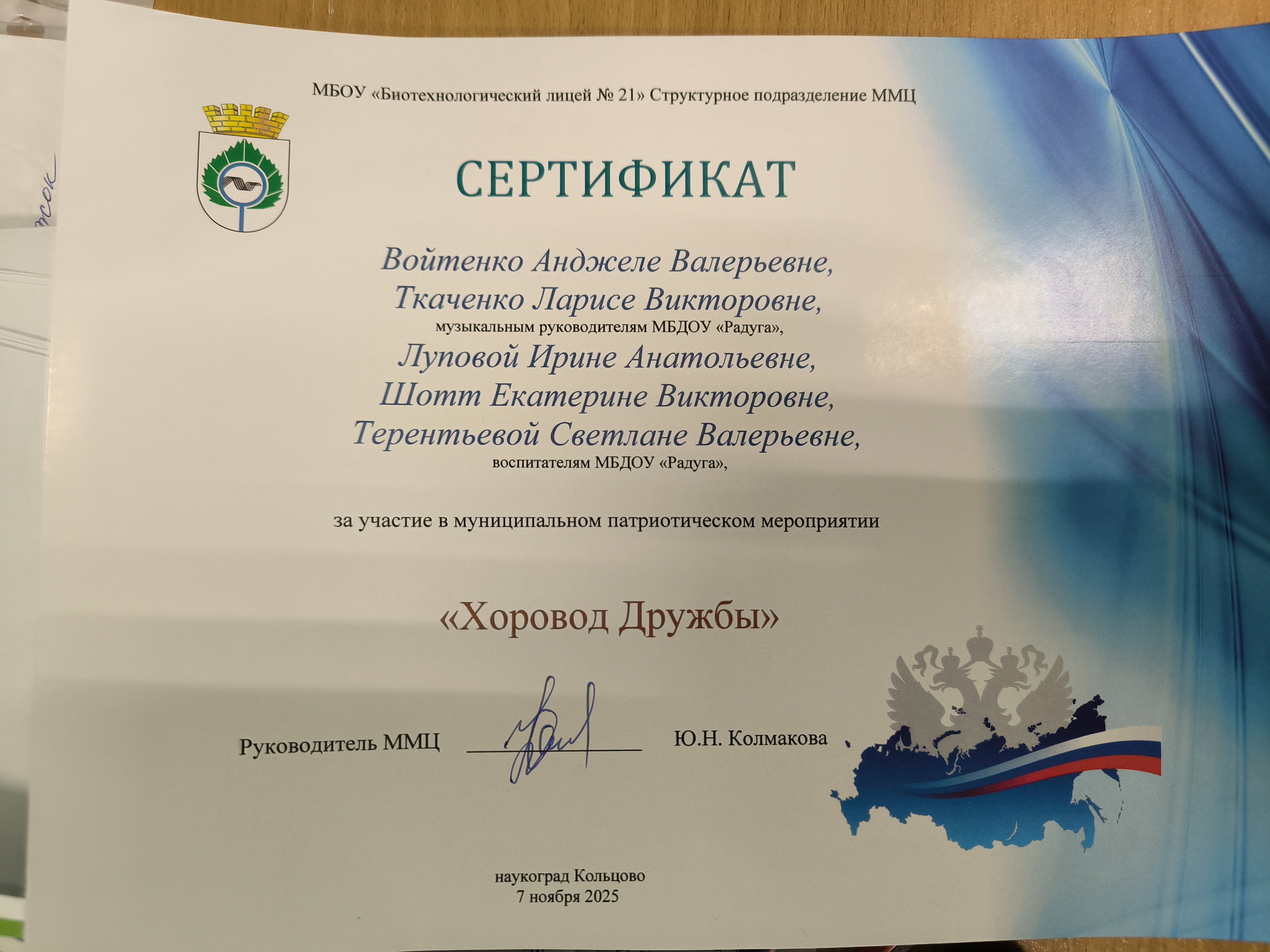 Сертификат за участие в патриотическом мероприятии "Хоровод дружбы". 2025г.