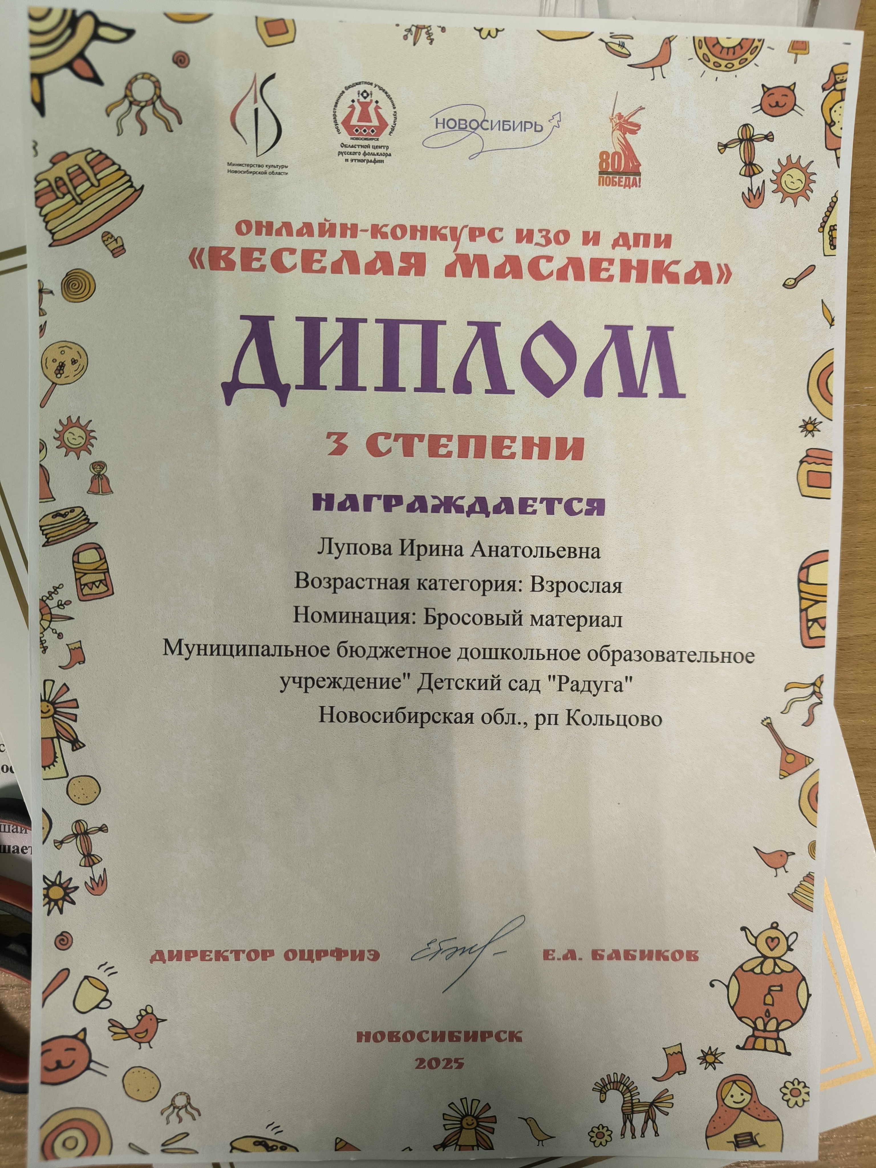 Онлайн- конкурс "Весёлая маслёнка" Диплом 3 степени. 2025 год