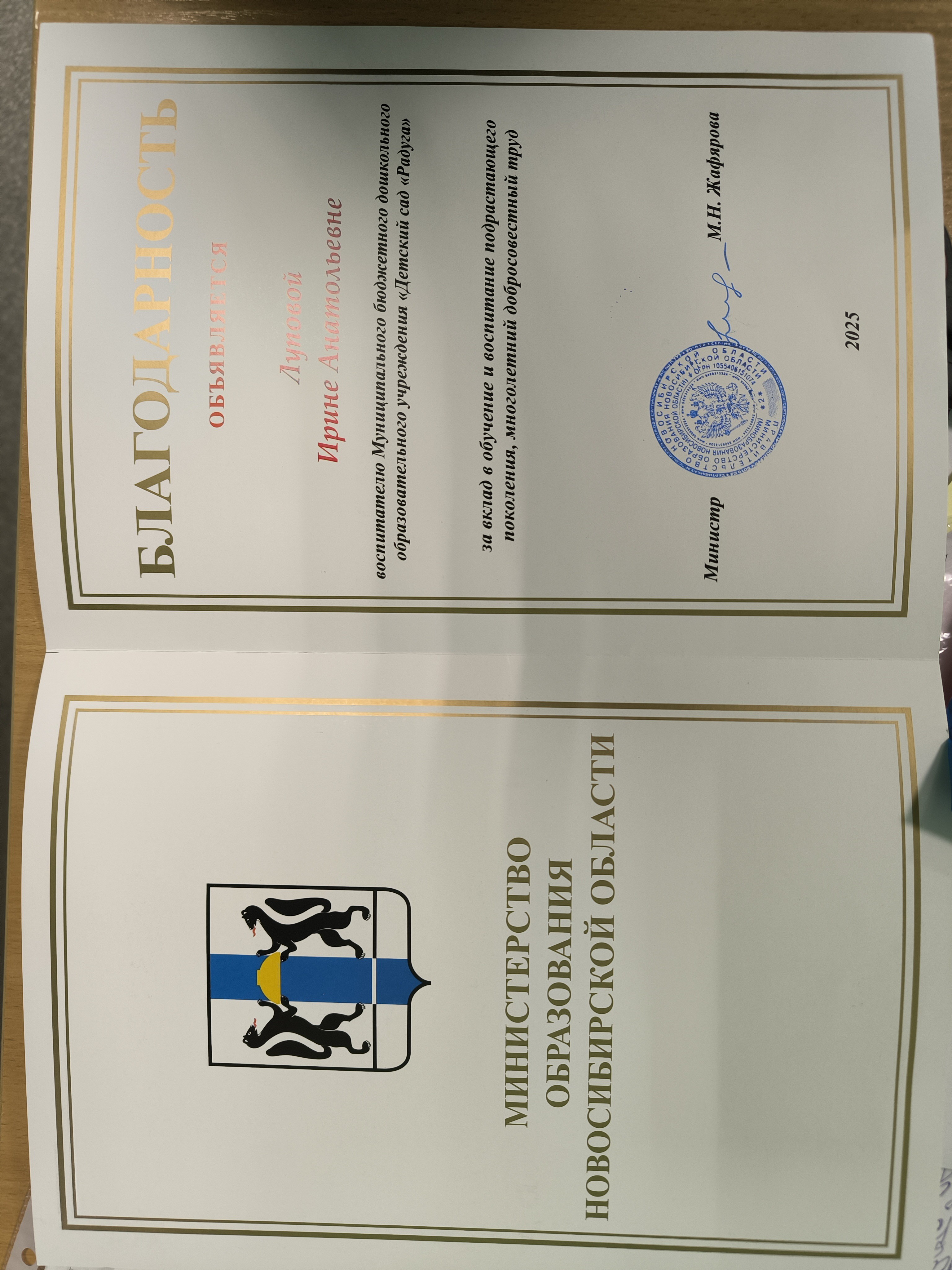 Благодарность за вклад в обучение и воспитание подрастающего поколения. 2025г.